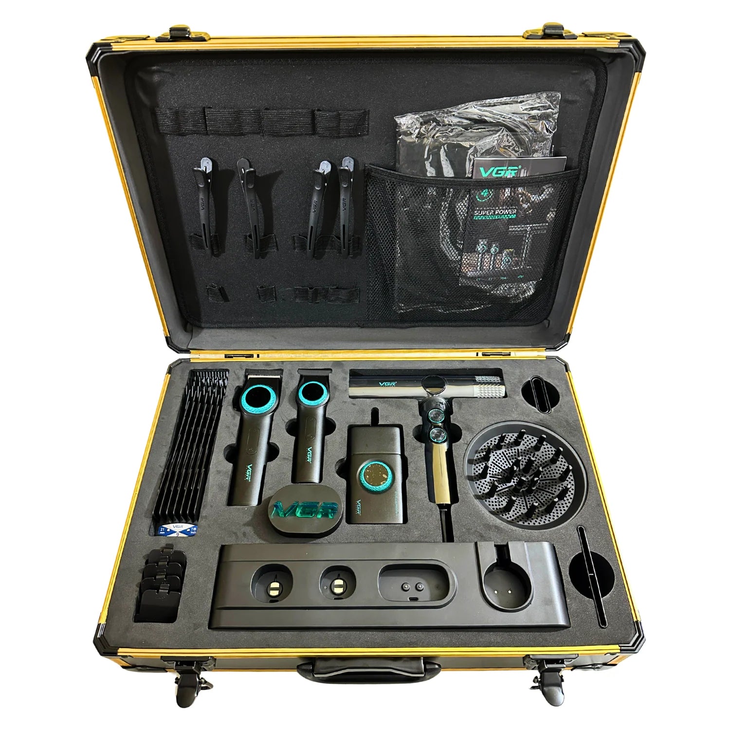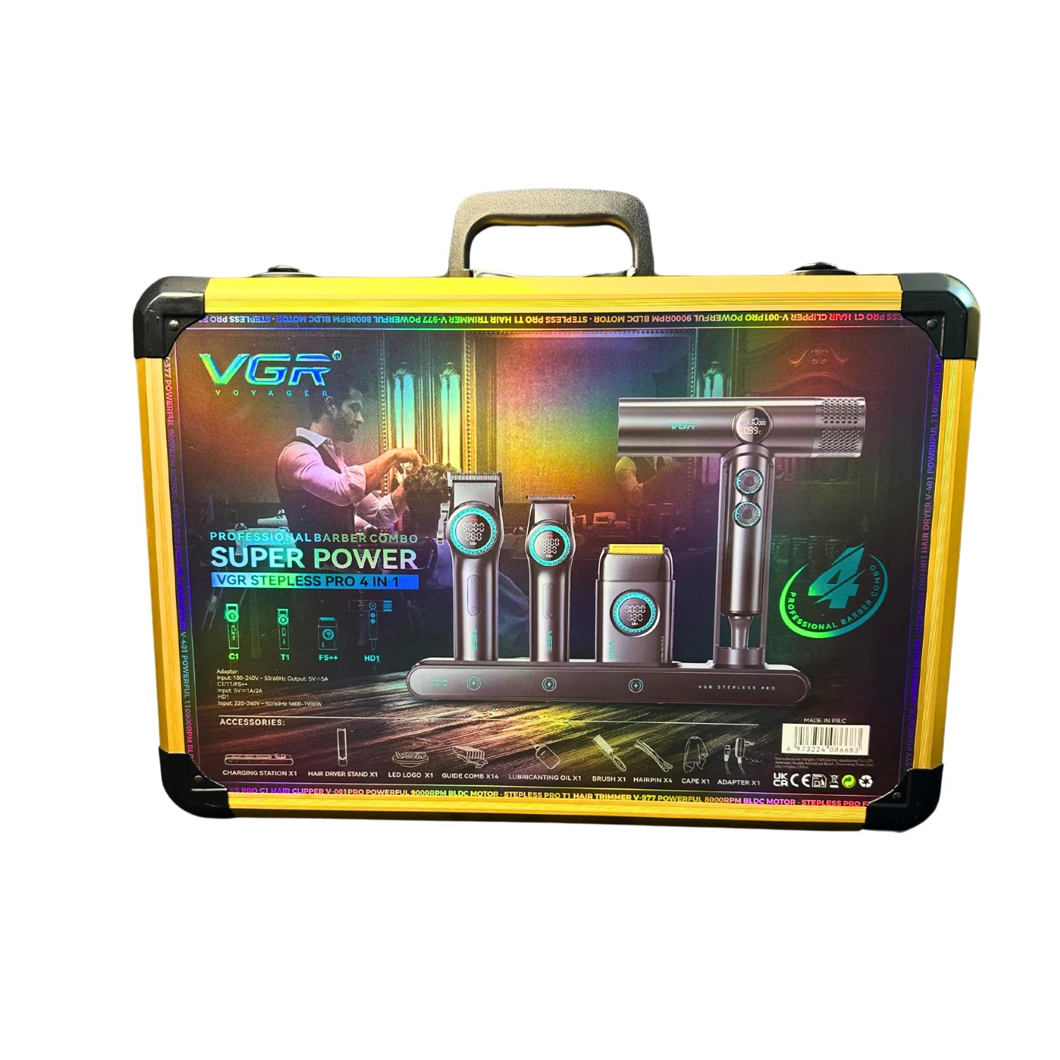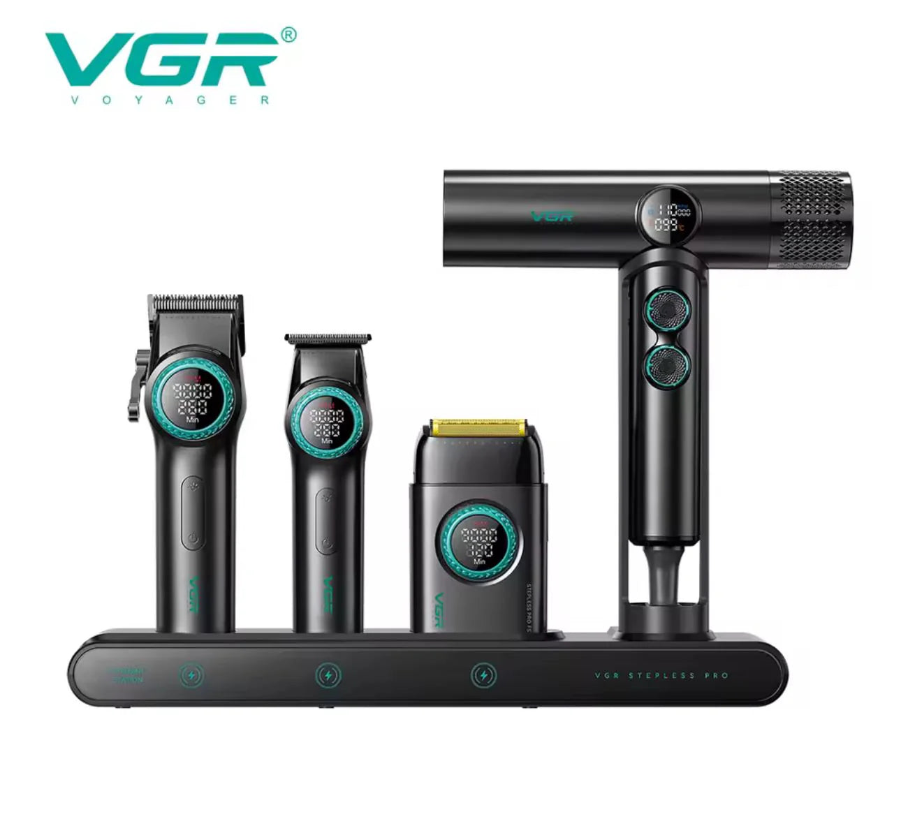 El Combo Kit VGR Professional 4 en 1 es un set completo y profesional diseñado para el cuidado y estilizado del cabello y la barba, ideal tanto para uso en barberías como para uso doméstico avanzado. Este kit reúne cuatro herramientas esenciales en una sola maleta práctica y portátil, facilitando su transporte y almacenamiento.